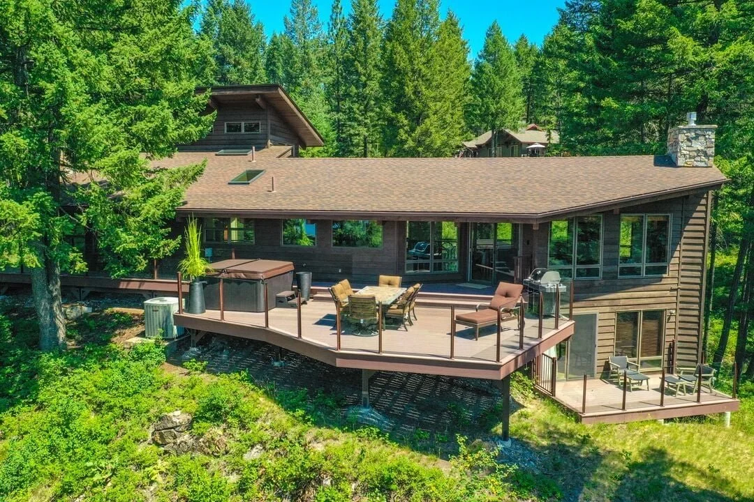 Massive wrap-around deck with outdoor dining table, brand-new 6-person hot tub, gas BBQ grill, and panoramic lake views